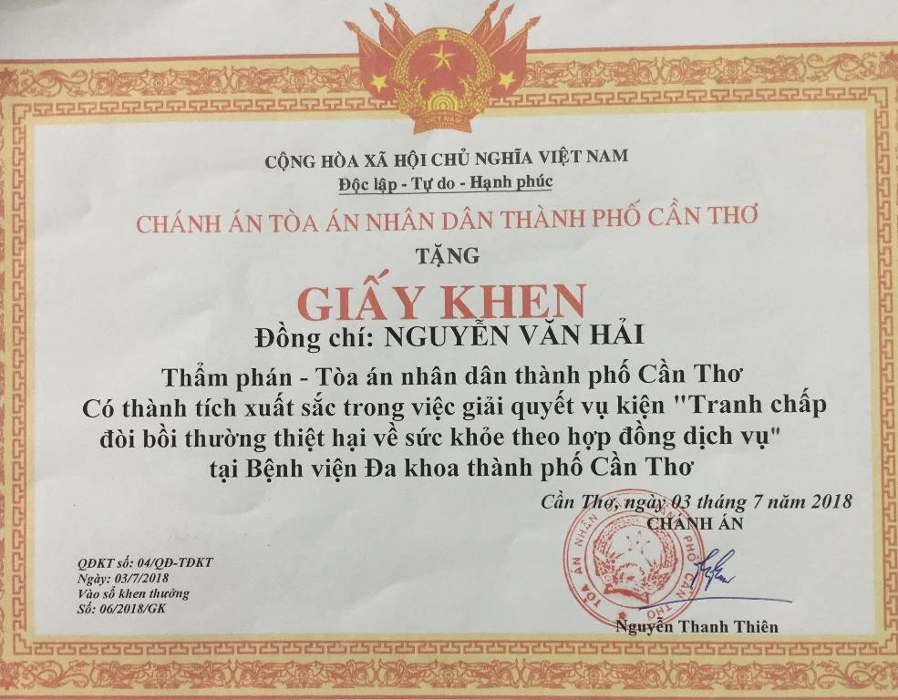 Ngày 5-7, ông Nguyễn Văn Hải - thẩm phán TAND TP Cần Thơ cho biết bản thân ông và tập thể HĐXX vừa được nhận giấy khen đột xuất của chánh án TAND TP Cần Thơ vì có thành tích xuất sắc trong việc hòa giải vụ kiện tranh chấp đòi bồi thường thiệt hại về sức khỏe theo hợp đồng dịch vụ.