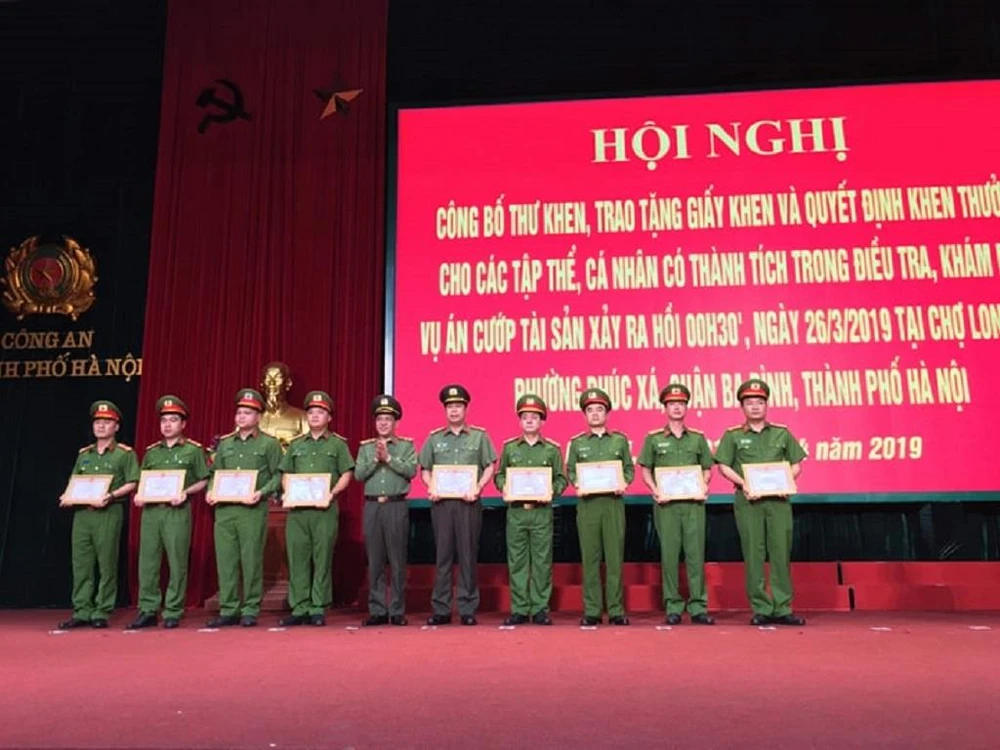 Chiều 1-4, Giám đốc Công an TP Hà Nội và Chủ tịch UBND quận Ba Đình đã biểu dương, khen thưởng đột xuất cho các tập thể, cá nhân có thành tích xuất sắc điều tra khám phá vụ án cướp tài sản, xảy ra ngày 26-3 tại chợ đầu mối Long Biên, phường Phúc Xá, quận Ba Đình.