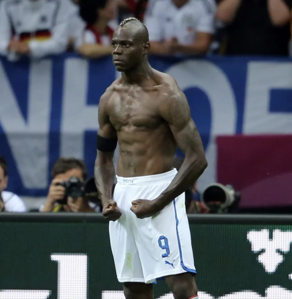 Sau khi ghi bàn cho tuyển Ý vào lưới tuyển Đức ở bán kết Euro 2012, “siêu quậy” Balotelli đã cởi phăng chiếc áo gồng mình lên khoe cơ bắp. Hình ảnh ăn mừng bàn thắng đó khắc sâu trong lòng người hâm mộ bóng đá đến tận bây giờ khi Balotelli ghi cả hai bàn giúp Ý hạ Đức vào chung kết.