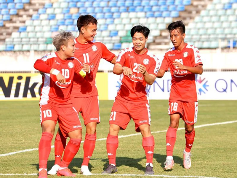 Công Phượng ghi bàn và được các đồng đội mới chúc mừng sau bàn thắng cho TP.HCM. Ảnh: AFC