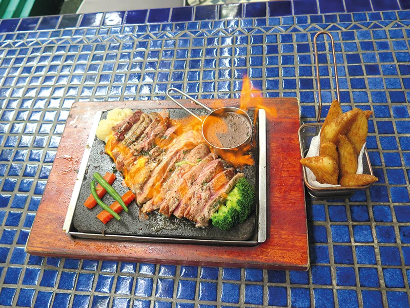 Thực khách mà ngắm nghía cách chế biến món ăn này thì cứ gọi là thả “icon” với biểu tượng “WAO” bởi màn trình diễn đốt rượu của đầu bếp. Khi miếng thịt được ướp thơm ngon đặt trên tảng đá nóng với nhiệt độ hơn 280 độ C thì anh đầu bếp sẽ tưới rượu brandy đều lên lớp thịt. Lửa bùng lên mang theo hương rượu nồng nàn và rồi lửa từ từ ôm trọn lấy miếng thịt. Sức nóng của lửa rượu từ bên trên kết hợp sức nóng của phiến đá núi lửa từ bên dưới giúp phần thịt chín thơm, đều bên ngoài, ẩm mềm bên trong.