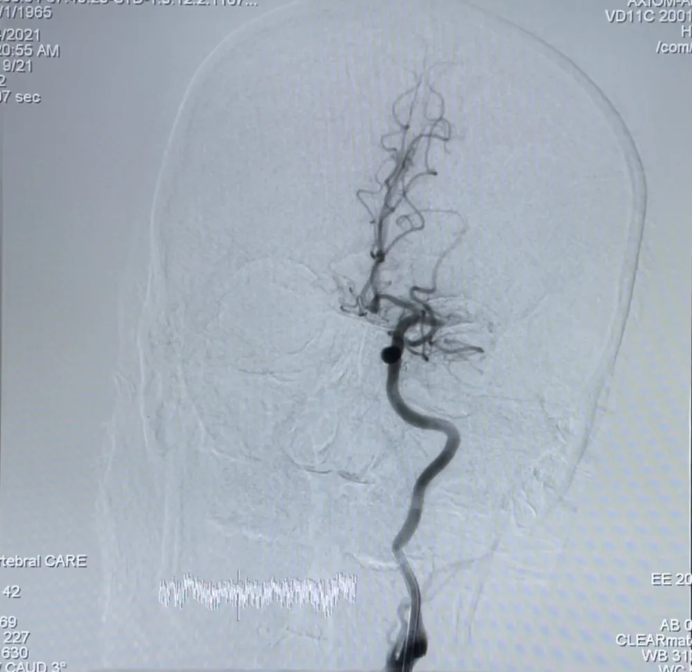 Bệnh nhân bị tắc hoàn toàn động mạch não giữa phía bên trái đoạn gốc. Ảnh: BVCC
