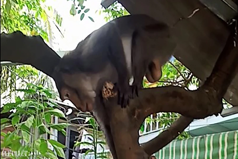 Con khỉ lấy bịch đậu phộng xé ra ăn một vài vốc rồi bỏ lại, leo lên cây đi đâu không rõ. Theo người dân, cá thể khỉ khá dạn người, thường hay xuất hiện vào chừng 9 giờ sáng mỗi ngày.