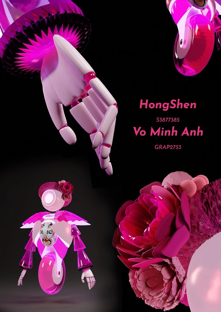 Còn với Võ Minh Anh, cô lấy ý tưởng từ những nét đẹp truyền thống là áo tứ thân, mấn đội đầu và mặt nạ hát bội. Minh Anh chọn nguyên liệu cho robot là thủy tinh và sử dụng thêm đèn neon màu hồng cánh sen. "Cô" robot quản gia này có tên HongShen, với khung robot mô phỏng áo tứ thân với mặt nạ hát bội ở trước bụng và nón của robot là mấn đội đầu đính hoa.