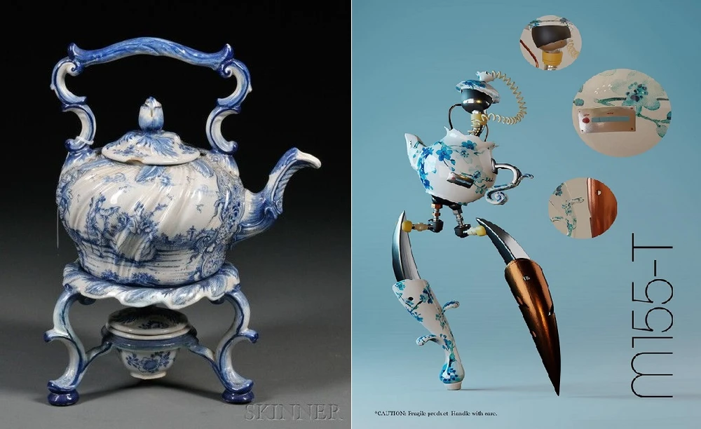"Quý bà" robot M155-T với ý tưởng thiết kế từ bình sứ và máy móc kim loại (Ảnh bình sứ: nguồn Pinterest). Ảnh: NVCC