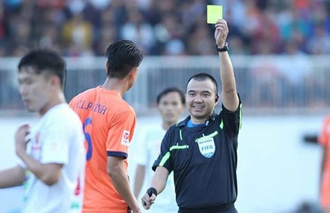 Trọng tài Phùng Đình Dũng xử phạt trong trận HA Gia Lai - SHB Đà Nẵng. Ảnh: TTVH
