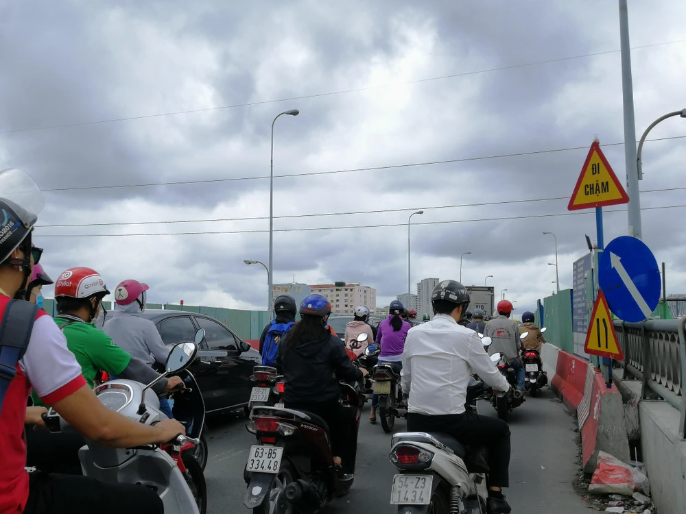 Các phương tiện nhích từng chút một qua cầu Kênh Tẻ. Ảnh: THU TRINH