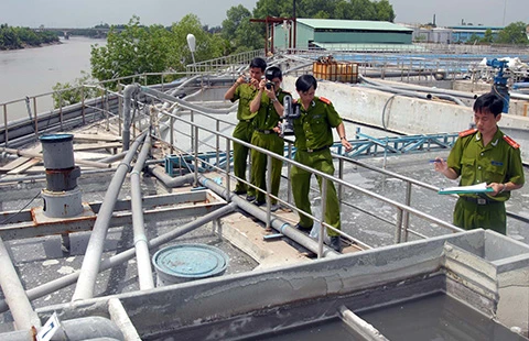 Lực lượng chức năng đang khám nghiệm hiện trường một doanh nghiệp vụ xả nước thải công nghiệp gây ô nhiễm môi trường. Ảnh: CTV