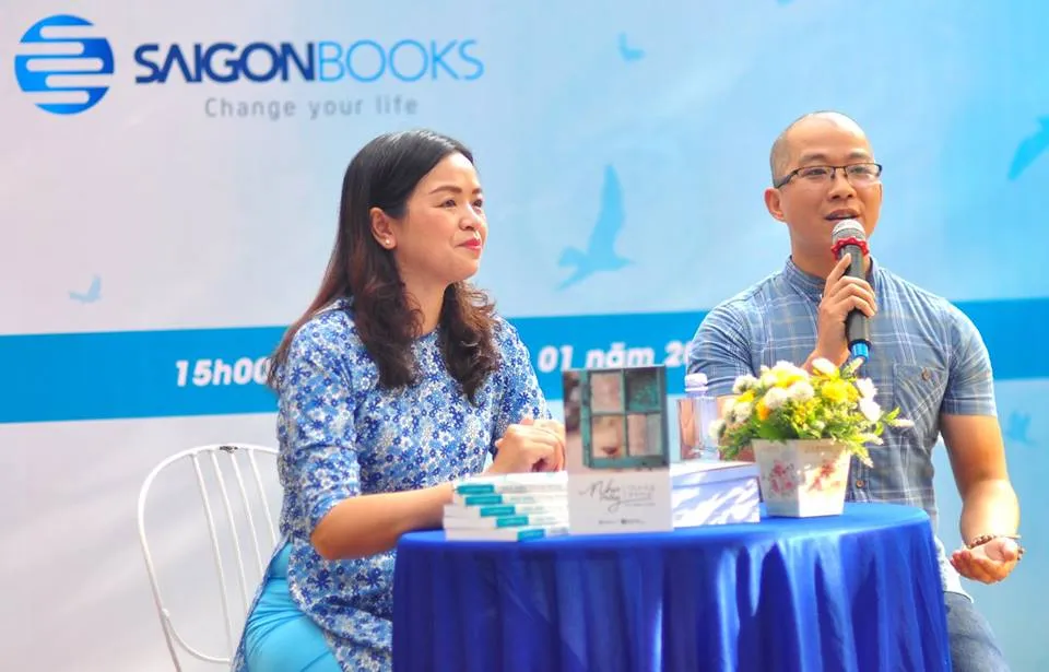 Tác giả Lưu Đình Long (phải ) và chuyên gia tâm lý Phạm Thị Thúy trả lời câu hỏi giao lưu.