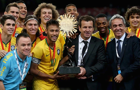 HLV Dunga (áo vest, cầm cúp) với mục tiêu giảm bớt chất nghệ sĩ của cầu thủ Brazil để thay cho bóng đá đẹp thành bóng đá thực dụng. Ảnh: GETTY IMAGES