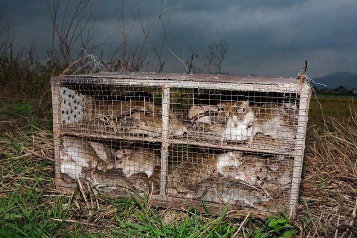 Chuột sau khi bắt được nhốt trong các lồng tre và chuyển đến các trung tâm chế biến trước khi phân phối tới các chợ hoặc quán nhậu.