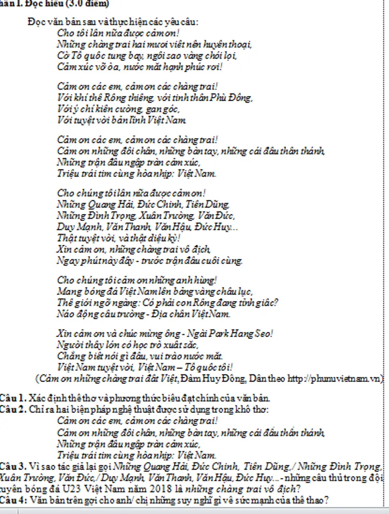 Trong đề luyện tập chuẩn bị cho bài viết số 1 học kì II của học sinh khối 12, tại phần Đọc – hiểu, kỳ tích của đội tuyển U23 cùng với sự biết ơn vô bờ của người hâm mộ dành cho các cầu thủ đã được đề cập.