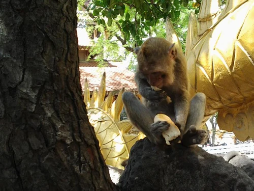 Hòa thượng Thích Huệ Thông, Viện chủ Châu Thới Sơn Tự, cho biết ngọn núi rộng cả trăm héc-ta, cây cối um tùm nên khỉ rừng kéo về sinh sống. "Ban đầu chừng chục con, sau chúng sinh sôi lên tới cả trăm con. Nhưng thời gian gần đây, số lượng đàn tụt giảm, khỉ dần biến mất, đặc biệt là những con trưởng thành”, hòa thượng nói.