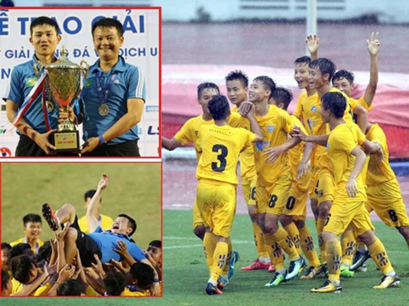 Ảnh 1 và 2: U-15 SL Nghệ An đăng quang dưới trướng hai ông thầy trẻ Như Thuật, Văn Quyến. Ảnh: VFF. Ảnh 3: Thầy Quyến được các học trò tung hô sau chức vô địch U-15 quốc gia. Ảnh: ĐỨC ĐỒNG