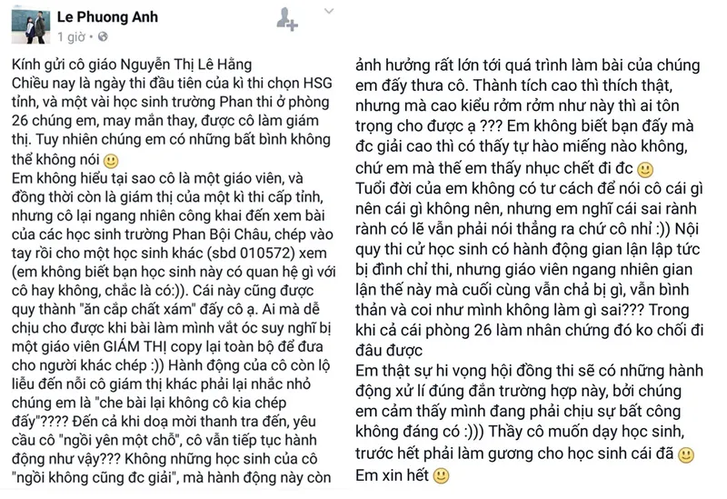 Như đã đưa tin, ngày 14-3, sau khi dự kỳ thi học sinh giỏi tỉnh Nghệ An năm học 2016-2017, em Lê Thị Phương Anh (học sinh lớp 11, Trường THPT chuyên Phan Bội Châu, TP Vinh, Nghệ An) lên Facebook nêu rõ có tiêu cực tại Hội đồng thi Trường THPT Lê Viết Thuật (TP Vinh).