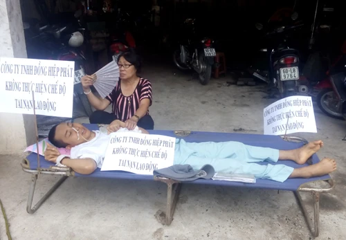 Sáng 26-6, người nhà khiêng anh Vũ Ngọc Dũng (21 tuổi) đến để trước cửa của Công ty TNHH cơ khí chính xác Đồng Hiệp Phát ở phường Tân Biên, TP Biên Hòa (Đồng Nai), yêu cầu công ty bồi thường tiền tai nạn lao động.