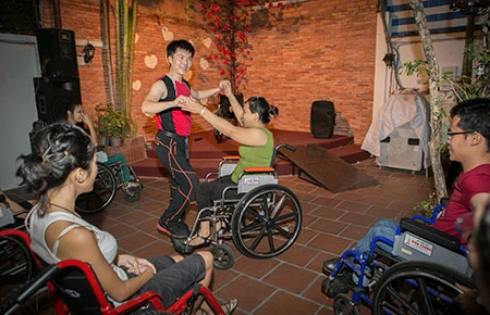 20 học viên trên 20 chiếc xe lăn hào hứng tập theo các động tác và tiếng hô nhịp nhàng của vũ sư. Dù là người khỏe mạnh, vũ sư Đinh Thanh Hiếu vẫn ngồi trên chiếc xe lăn hướng dẫn cho học viên nhằm gần gũi với mọi người. Anh cũng chính là người đưa ra đề nghị dạy khiêu vũ trên xe lăn miễn phí cho người khuyết tật với Trung tâm DRD.