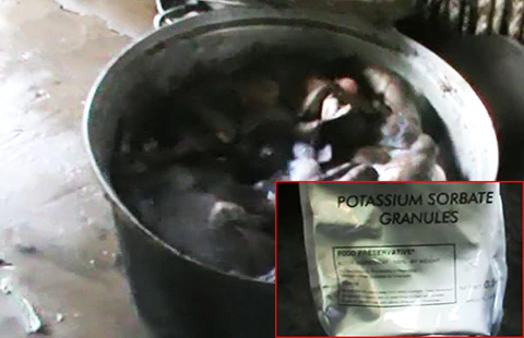 Điều đáng quan tâm là đoàn kiểm tra thu được nhiều chai nhựa đựng một loại nước đen, thơm mùi thịt bò. Cạnh đó là một bao nhỏ in tiếng nước ngoài, bên trong đựng thứ bột màu trắng. Một chiếc nồi nhôm cạnh bên chứa một thứ nước sền sệt màu đen còn bốc khói.