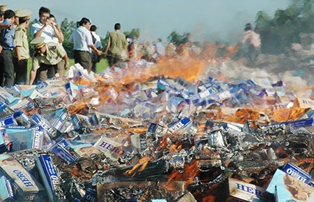 Cơ quan chức năng tiêu hủy thuốc lá lậu ở ĐBSCL. Ảnh: PHI NGUYỄN