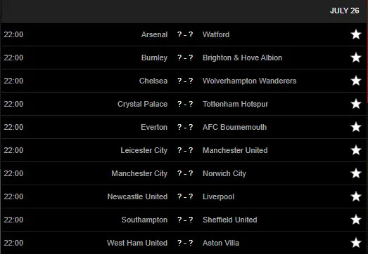 22h đêm nay (26-7), lượt trận cuối cùng Premier League mùa 2019-2020 sẽ diễn ra trên khắp các sân cỏ nước Anh. Hiện tại, giải ngoại hạng Anh đã xác định được nhà vô địch là Liverpool và đội nhì bảng Man City. Hai CLB này cũng đại diện cho nước Anh tham dự Champions League mùa sau.
