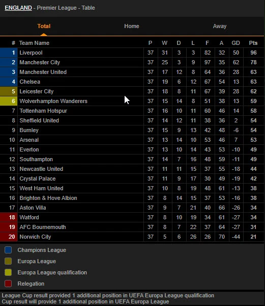 Tuy nhiên, Wolverhampton chính là “chú ngựa ô” ở mùa giải năm nay. Hiện Wolverhampton đang giữ vị trí thứ sáu với 59 điểm. Wolverhampton sẽ cạnh tranh vé dự vòng loại Europa League với Tottenham (58 điểm) .