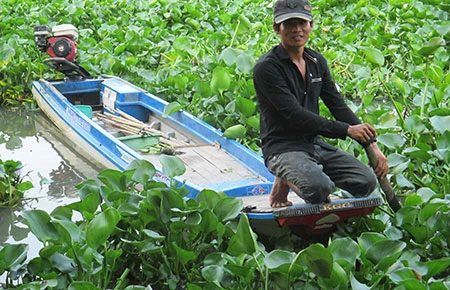 Ghe nhỏ của anh Đặng Quốc Trung bị lục bình bao vây. Ảnh: N.Hoàng
