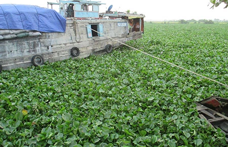 Nhiều ghe thuyền đành án binh bất động vì lục bình dày đặc. Ảnh: N.Hoàng