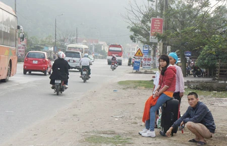Chiều 7-2, một số hành khách vẫn mệt mỏi chờ xe trên quốc lộ 1A (đoạn qua huyện Nghi Xuân, Hà Tĩnh) để vào Nam. Ảnh: ĐẮC LAM