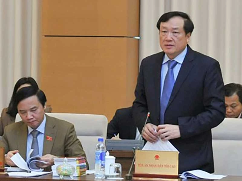 Chánh án TAND Tối cao Nguyễn Hòa Bình đang trình bày ý kiến về dự án Luật Trách nhiệm bồi thường của Nhà nước (sửa đổi) tại phiên làm việc của UBTVQH sáng 9-1. Ảnh: QH