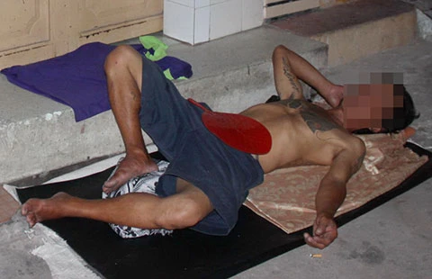 Hơn một năm nay, ngày thì T. đi nhặt ve chai để kiếm tiền hút chích, tối đến thì trải bạt ngủ ngoài trời. Ảnh: H.LAN