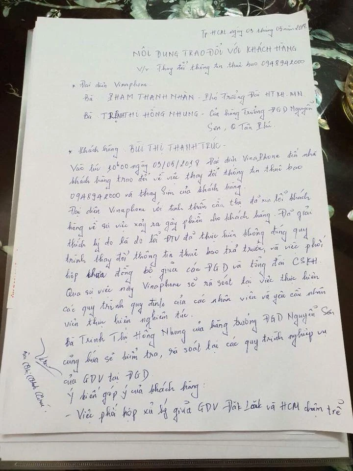 “Việc phối hợp giữa giao dịch viên ở Đắk Lắk và TP.HCM chậm trễ gây mất liên lạc với khách hàng. Đáng lý ra khi xảy ra sự cố nhà mạng phải có trách nhiệm liên hệ và trả SIM cho chính chủ nhanh chóng, không nên để khách hàng chờ đợi. Khách hàng đề nghị nhà mạng cùng chia sẻ khoản chi phí do mất thông tin liên lạc đã làm ảnh hưởng đến công việc làm ăn của khách hàng” - chị Trúc có ý kiến tại buổi làm việc.