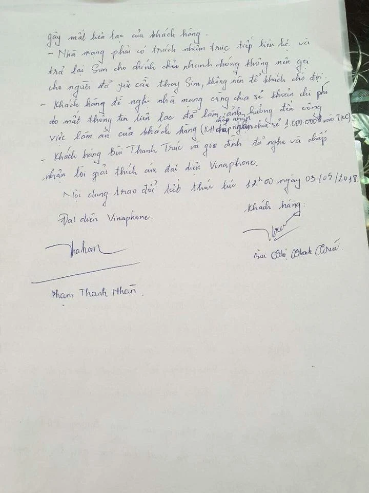 Tại buổi làm việc, đại diện VinaPhone đã xin lỗi chị Trúc về sự việc xảy ra gây phiền hà cho chị. Đồng thời, phía VinaPhone giải thích lý do xảy ra sự cố trên là vì điện thoại viên thực hiện không đúng quy trình thay đổi thông tin thuê bao trả trước và việc phối hợp chưa đồng bộ giữa các điểm giao dịch với tổng đài chăm sóc khách hàng. Qua sự việc này, VinaPhone sẽ rà soát việc thực hiện những quy trình quy định của các nhân viên và yêu cầu nhân viên nhà mạng thực hiện nghiêm túc.