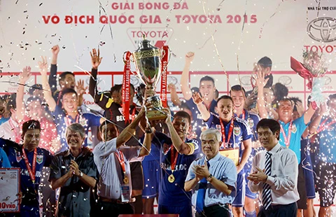 B. Bình Dương nhận cúp vô địch V-League 2015 trên sân của Đồng Tháp. Ảnh: XUÂN HUY