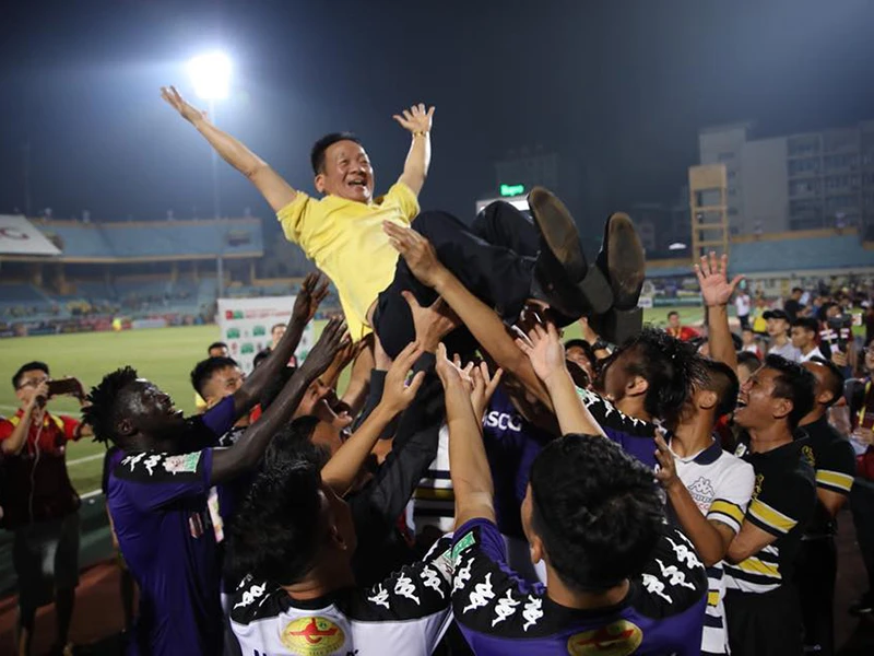 Hà Nội đăng quang và cầu thủ mừng công bầu Hiển. Ảnh: TTVH