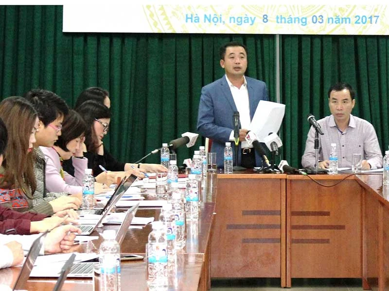 Ông Trần Đức Thắng, Cục trưởng Cục Quản lý công sản, đang nói về vấn đề khoán xe công tại buổi họp báo chiều 8-3. Ảnh: TRÀ PHƯƠNG