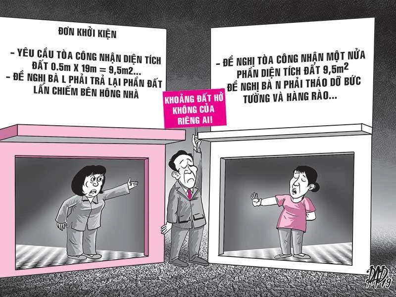Ngược lại, bà L. đề nghị tòa công nhận gần một nửa phần diện tích đất thuộc khoảng hở trên (gồm hai đoạn) thuộc quyền sử dụng của mình. Ngoài ra, bà L. cũng có yêu cầu phản tố đề nghị bà N. tháo dỡ bức tường mặt tiền và hàng rào hiện hữu dọc theo giữa hai nhà, hoàn trả phần diện tích nêu trên cho bà.