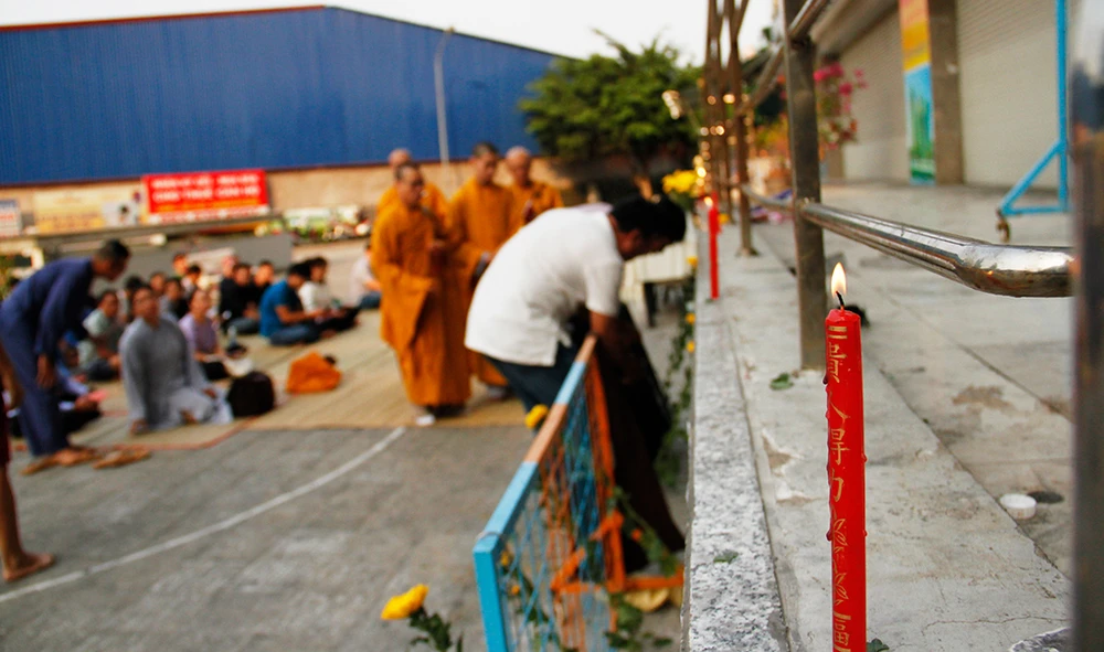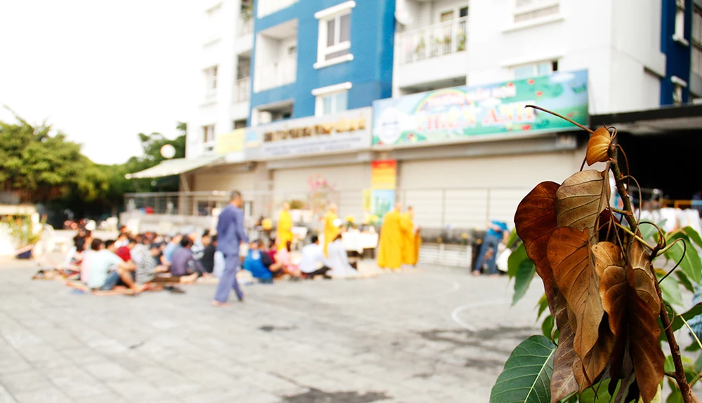 Sáng 27-3, nhiều cư dân chung cư Carina tập trung để phát tâm cầu siêu cho các nạn nhân đã không may gặp nạn trong đám cháy kinh hoàng xảy ra 5 ngày trước đó.