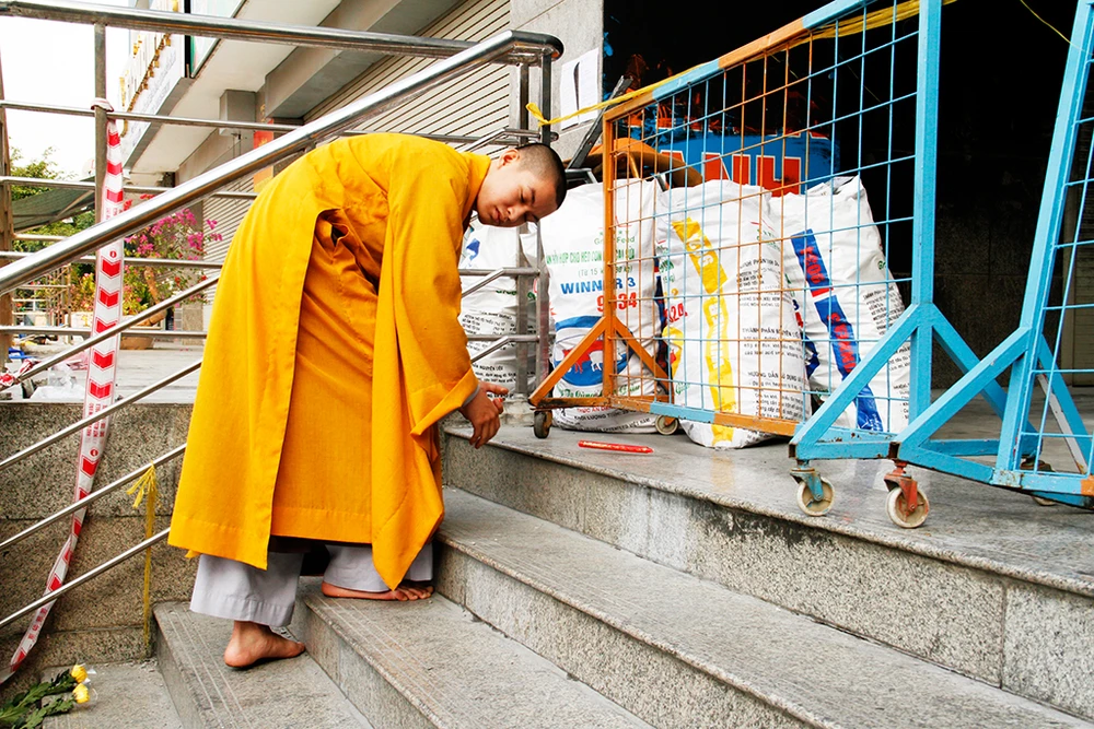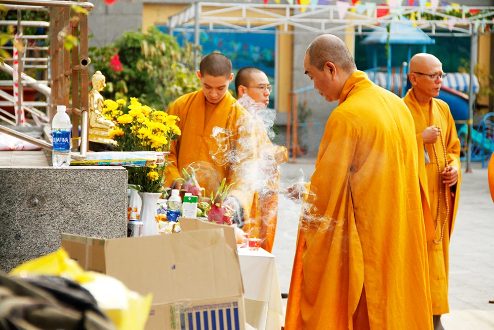 Các sư thầy ở chùa Giác Ngộ (quận 10) cũng đến từ sớm để hướng dẫn người dân đặt hoa, thắp nến.