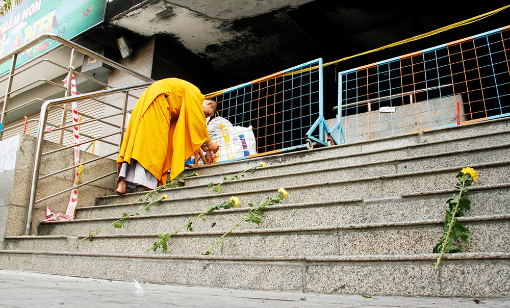 Những đóa cúc vàng được người dân rải dọc bậc thang của lối đi vào sảnh block A nơi trước đó vào rạng sáng 23-3 nhiều cư dân đã tháo chạy ra ngoài khi khói lửa đến.