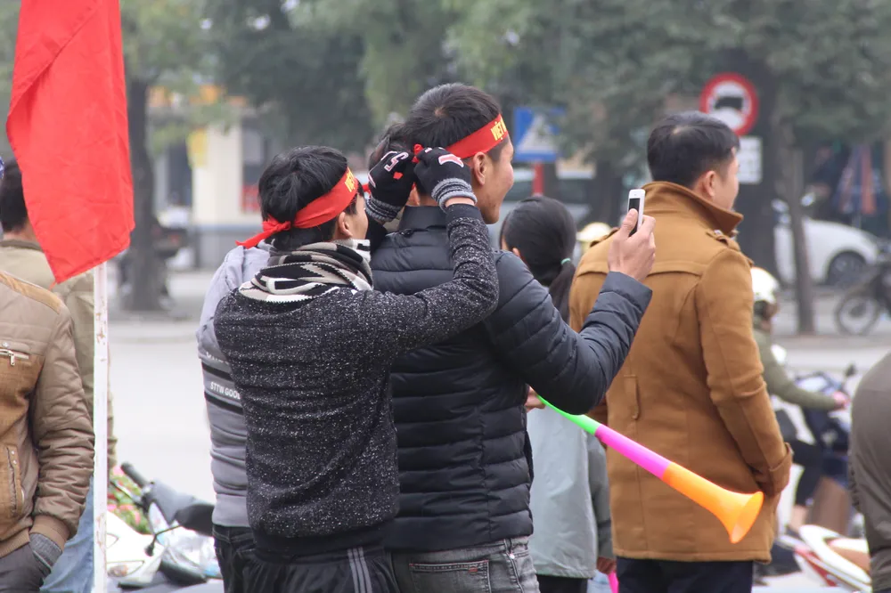 Và để chào đón các tuyển thủ, người bạn phía sau với cử chỉ nhẹ nhàng buộc băng rôn với dòng chữ "Việt Nam vô địch" trong khi người bạn phía trước tranh thủ tự sướng.