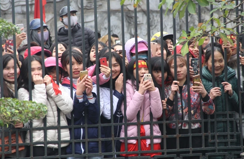 Giữa cái rét 9 độ C, nhiều cổ động viên nữ vẫn kiên nhẫn chờ đợi những "người hùng U-23 Việt Nam là người con xứ Thanh".