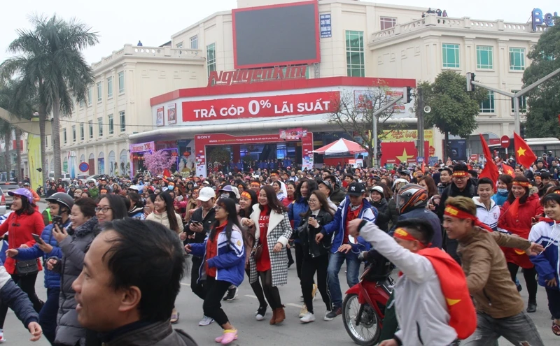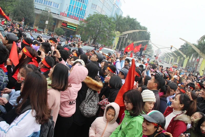 Dòng người hâm mộ lao xuống đường khi phát hiện ra xe chở ba tuyển thủ là Lê Văn Đại, Bùi Tiến Dũng và Bùi Tiến Dụng.