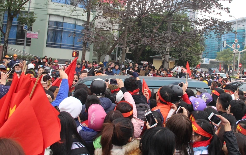 Và rồi chiếc xe chở ba tuyển thủ đã không thể nhúc nhích khi "biển người" hâm mộ vây quanh với mong muốn nhìn thấy các tuyển thủ.
