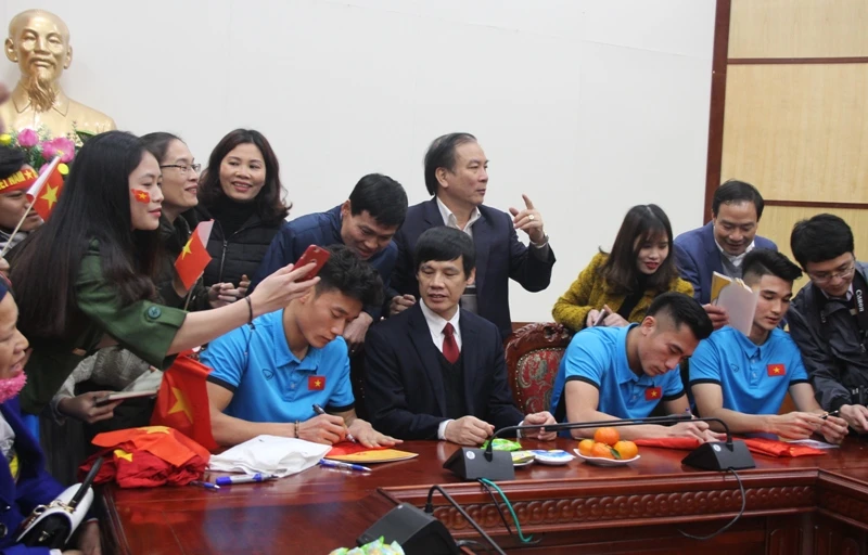 Cuối cùng các tuyển thủ cũng đã vượt muôn trùng vây để vào đến trụ sở và ký tặng người hâm mộ.