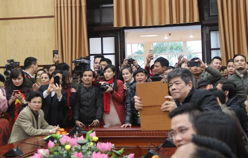 Xung quanh hàng rào UBND tỉnh Thanh Hóa đông nghẹt người hâm mộ mong được nhìn thấy các tuyển thủ U-23 xứ Thanh.