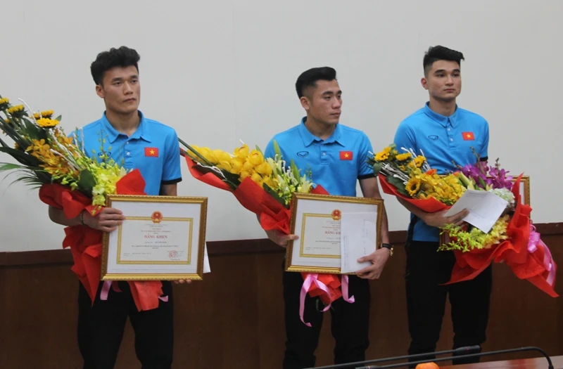 Ba tuyển thủ từ trái qua là thủ môn Bùi Tiến Dũng, tiền vệ Bùi Tiến Dụng và hậu vệ Lê Văn Đại nhận bằng khen với tổng số tiền thưởng 500 triệu đồng từ UBND tỉnh Thanh Hóa và các doanh nghiệp.