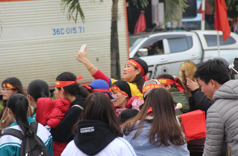 Tranh thủ lúc ba tuyển thủ chưa về, một cổ động viên nữ chụp ảnh tự sướng và phía sau là hàng ngàn cổ động viên.