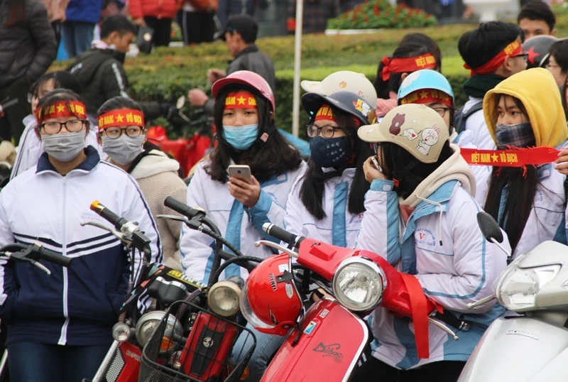 Hai cổ động viên vẫy lá cờ Tổ quốc liên tục và luôn nở nụ cười rạng ngời chào đón các tuyển thủ dù các tuyển thủ chưa về đến nơi.
