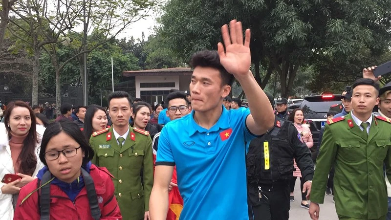 Các tuyển thủ Bùi Tiến Dũng, Lê Văn Đại, Bùi Tiến Dụng vẫy chào người hâm mộ và trở về nhà sau một thời gian dài lên tuyển và thi đấu giải U-23 châu Á ở Thường Châu (Trung Quốc).
