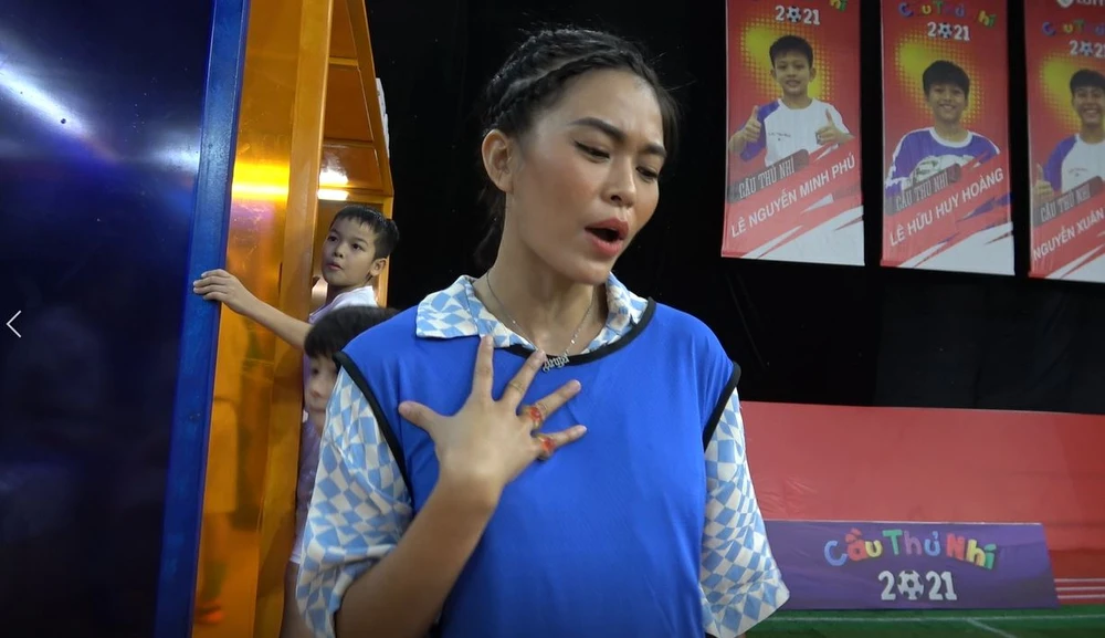 Sau khi chụp hình, Mâu Thủy đã chọn cho mình một chỗ ngồi lý tưởng trên khán đài để ăn vặt cùng các cầu thủ nhí. Chuyện sẽ không có gì đáng nói nếu nữ đội trưởng không tìm được những chiếc kẹo dẻo có hình vòng tròn và đeo vào làm nhẫn.